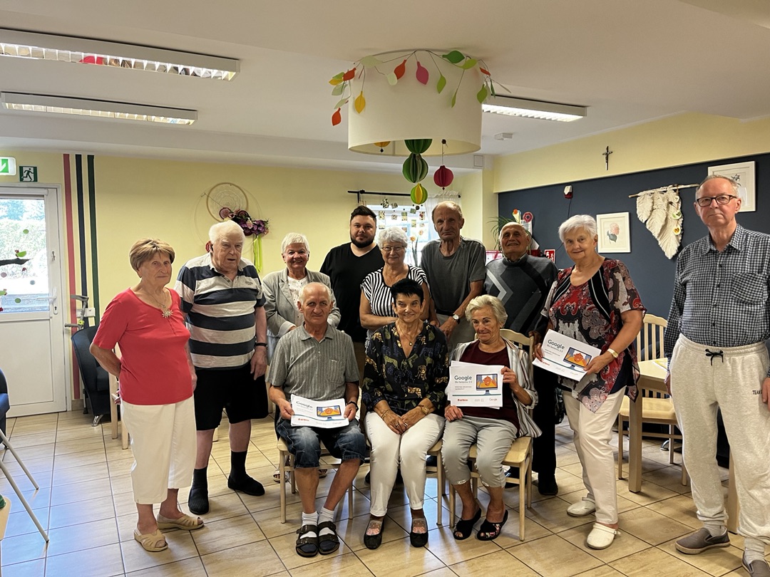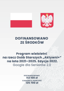 Projekt dofinansowany ze środków programu wieloletniego na rzecz Osób Starszych „Aktywni+” na lata 2021–2025. Google dla Seniorów 2.0 to inicjatywa, która skierowana jest do osób powyżej 60 roku życia z województwa śląskiego. Jej celem jest zwalczanie wykluczenia cyfrowego w tej grupie wiekowej poprzez organizowanie warsztatów w 30 gminach województwa. Uczestnicy szkoleń są zapoznawani z narzędziami Google i ich praktycznym wykorzystaniem w życiu codziennym. Koordynator Anita Drygajło Grupa docelowa inicjatywy charakteryzuje się niskim poziomem wiedzy na temat nowych technologii i ich praktycznym wykorzystaniem. Bezpośrednimi uczestnikami naszego projektu jest 300 osób powyżej 60 roku życia, które mieszkają na terenie województwa śląskiego. Działania prowadzone są w miejscowościach: Będzin, Czeladź, Czechowice-Dziedzice, Jaworzno, Gostyń, Lubliniec, Piekary Śląskie, Pszczyna, Jastrzębie Zdrój, Świętochłowice, Tarnowskie Góry, Zawiercie, Żory, Żywiec, Knurów, Częstochowa, Racibórz, Mikołów, Mysłowice, Katowice, Sosnowiec, Świerklany, Czerwionka-Leszczyny, Bieruń, Tarnowskie Góry oraz Węgierska Górka. Dodatkowo, nasze działania docierają do organizacji pozarządowych, które otrzymują od nas scenariusz i materiały warsztatowe do powtórnego wykorzystania i przeprowadzenia warsztatów. W ramach inicjatywy Google dla Seniorów 2.0 przeprowadzamy 270 godzin warsztatów, podczas których seniorzy podnoszą swoje kompetencje cyfrowe i zdobywają nowe umiejętności. Seniorzy zyskują wiedzę z zakresu korzystania z platformy YouTube, Google Maps, Google Meet, tłumacza. Sposób monitorowania: wykonanie testu na koniec. Poprzez przeprowadzenie cyklu szkoleń zmniejszamy poziom wykluczenia cyfrowego u uczestników naszego projektu. Tworzymy materiały szkoleniowe dostosowane do percepcji osób starszych, a scenariusze zajęć udostępniamy innym organizacjom pozarządowym. Przyczyniamy się do wzrostu kompetencji cyfrowych u osób starszych z małych i średnich miejscowości na Śląsku. 30 grup senioralnych poznaje nowe narzędzia i możliwości wynikające z posługiwania się nowymi technologiami. Zdobyte dzięki warsztatom umiejętności pozwalają uczestnikom projektu na większą samodzielność w cyfrowym świecie. Pandemia COVID-19 ujawniła problem wykluczenia cyfrowego w grupie osób powyżej 60 roku życia. Inicjatywa Google dla seniorów odpowiada na potrzeby osób starszych. Dzięki niej seniorzy z różnych miejscowości województwa śląskiego zapoznali się z nowymi narzędziami i aplikacjami, ale również nauczyli się korzystać z przydatnych narzędzi za pomocą urządzeń mobilnych. Uczestnictwo w zajęciach pozytywnie wpłynęło na aktywizację seniorów i pozwoliło nawiązać nowe znajomości. Dzięki inicjatywie uczestnicy stali się aktywnymi uczestnikami świata internetowego i przełamali krzywdzące stereotypy o osobach starszych.